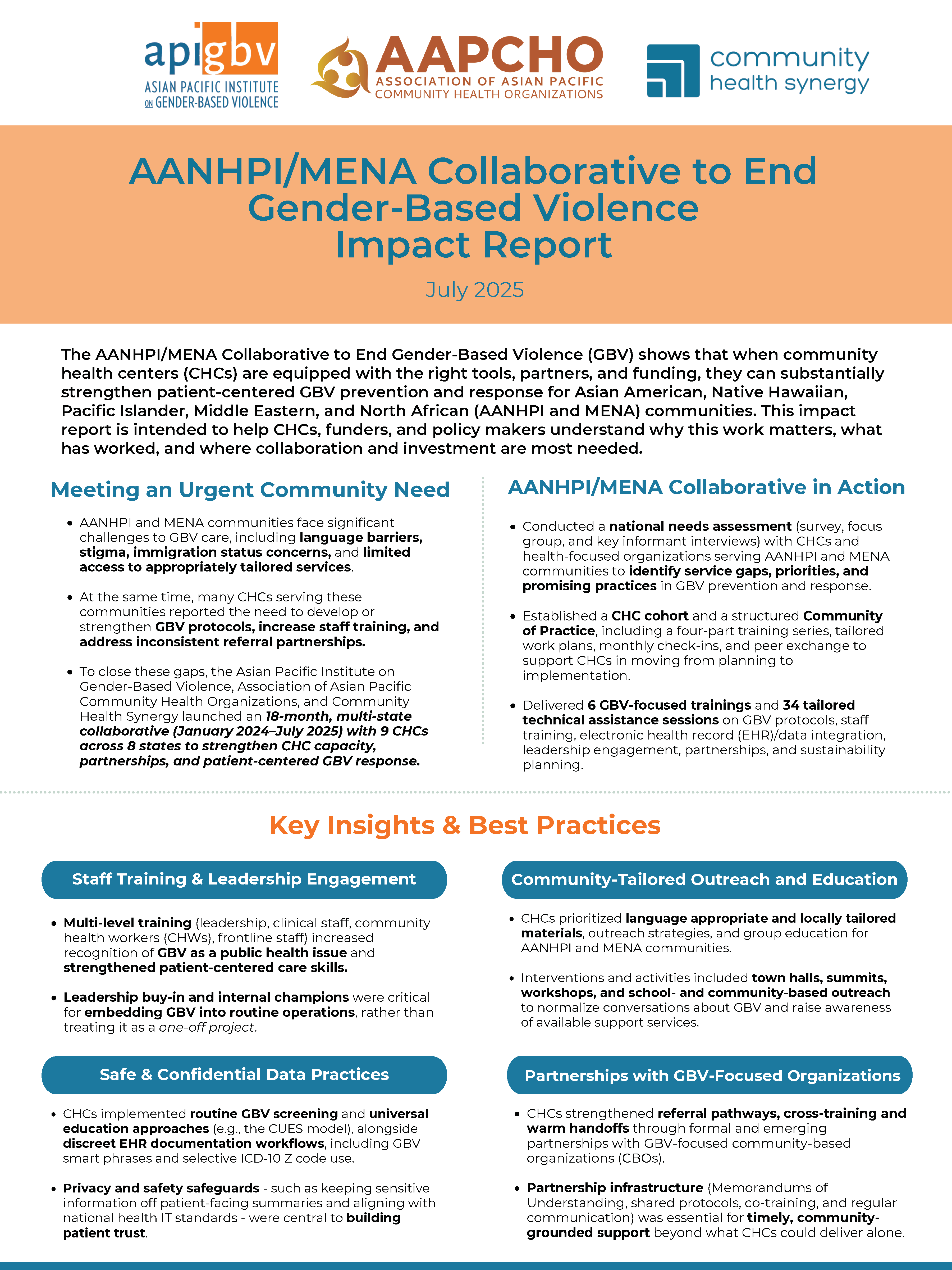 This impact report documents an 18‑month AANHPI/MENA Collaborative with nine community health centers that expanded GBV screening, universal education, and survivor-centered care for AANHPI and MENA patients. It highlights concrete practice changes, training and convening outcomes, and next-step policy and funding opportunities to sustain GBV protocols, deepen CHC–CBO partnerships, and build a more just, healing-centered system for survivors and their families.