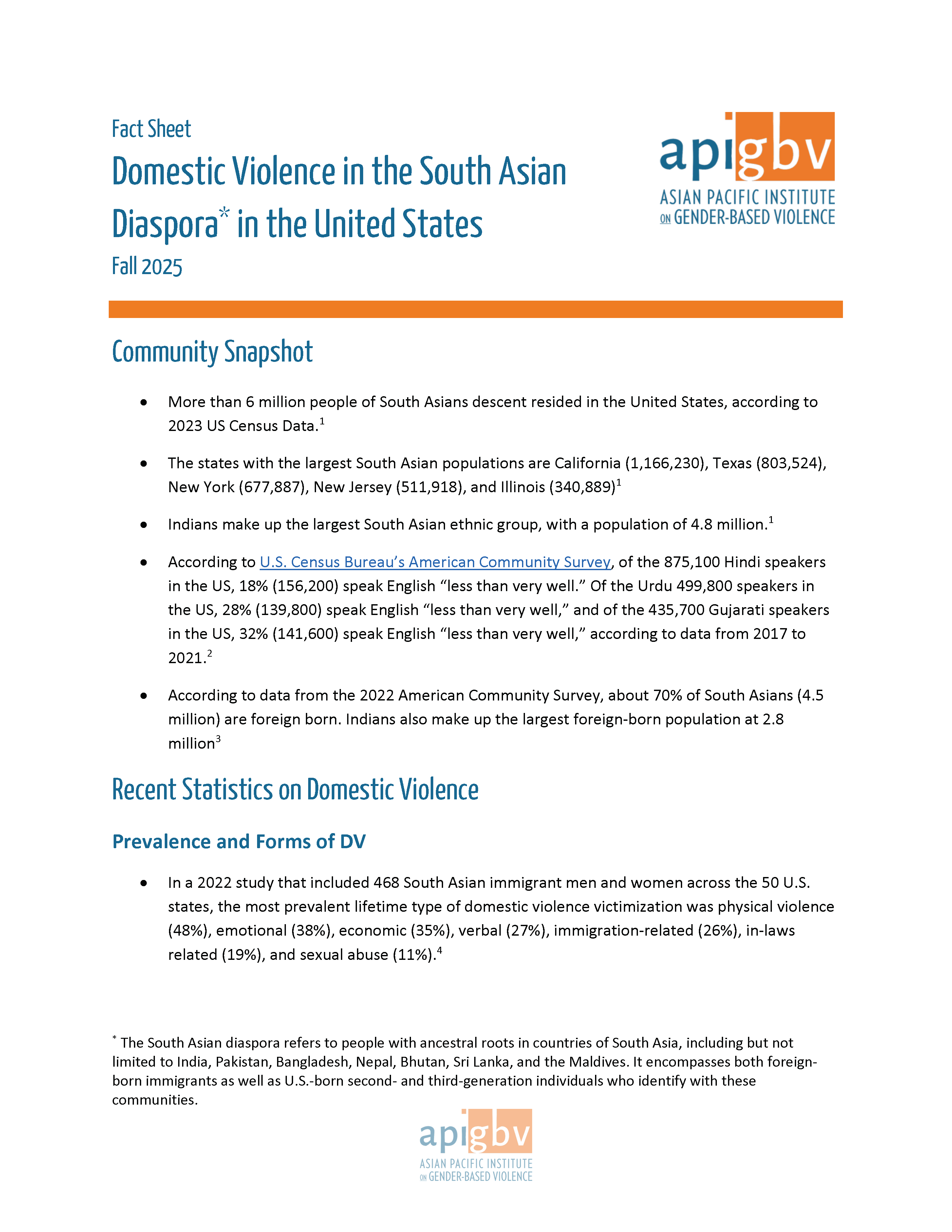 Domestic and gender violence manifest differently across communities: prevalence and incidence rates, attitudes to domestic violence and help-seeking, culturally rooted types of abuses, and traditional norms for women and men, vary. This factsheet on violence and help seeking in South Asian (Bangladeshi, Bhutanese, Indian, Nepali, Pakistani, and Sri Lankan) communities includes: