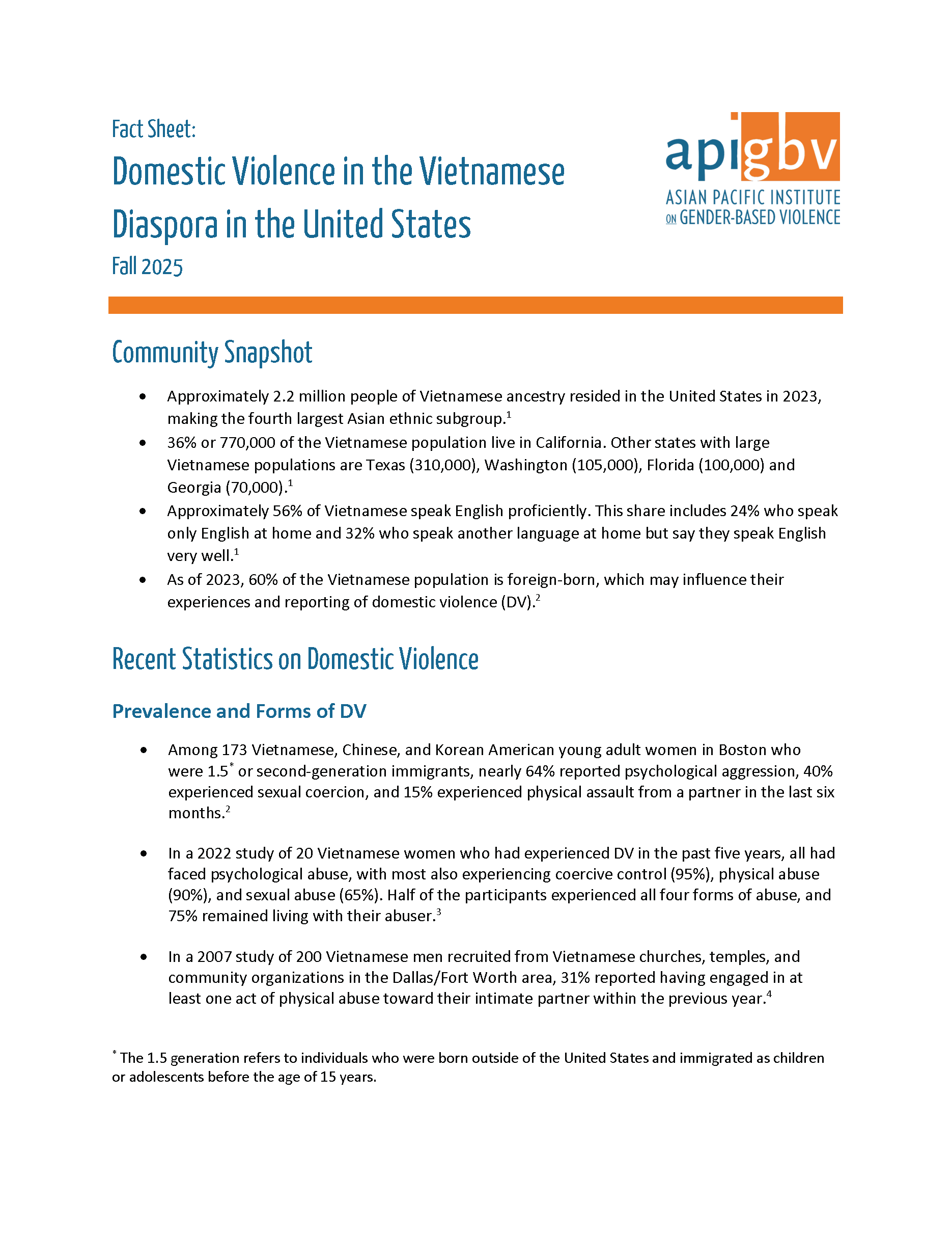 This factsheet compiles statistics on domestic violence, sexual violence, domestic violence related homicide, stalking, children’s exposure to family violence, and human trafficking in Asian and Pacific Islander communities.