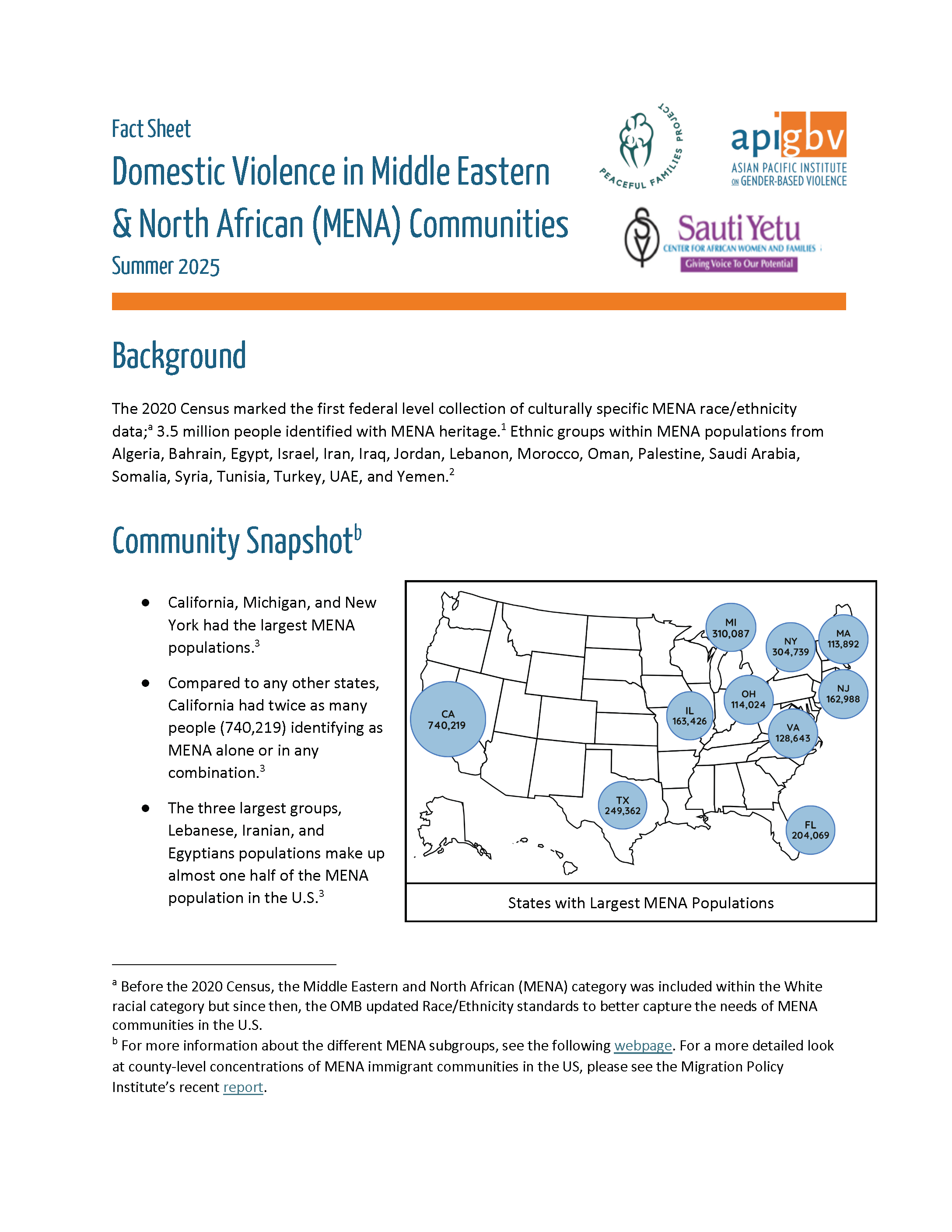 This factsheet compiles statistics on domestic violence, sexual violence, domestic violence related homicide, stalking, children’s exposure to family violence, and human trafficking in Asian and Pacific Islander communities.